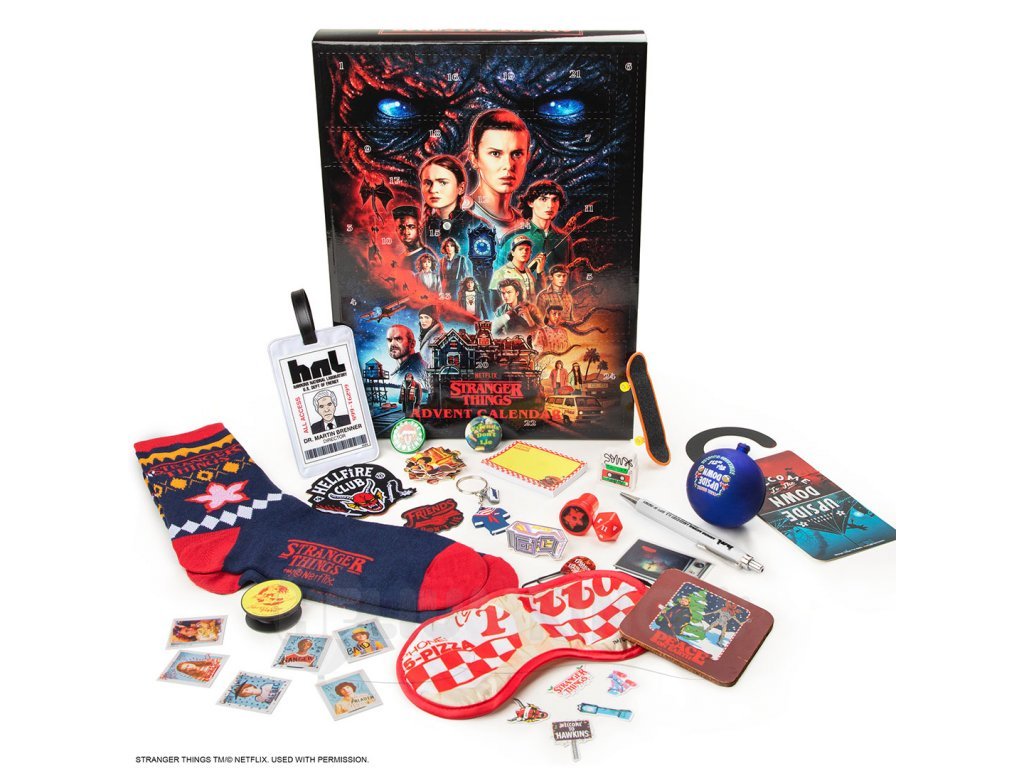 Advetný kalendár Stranger Things obsahuje 24 rôznych darčekov: Ponožky, mini prstové korčule, mini puzzle, pečiatka, visačka na batožinu, poznámkový blok, záložka, kľúčenka, špendlík, spinka, odznak, odznak, nálepky, pero, vešiak na dvere, + ďalšie prekvapenia