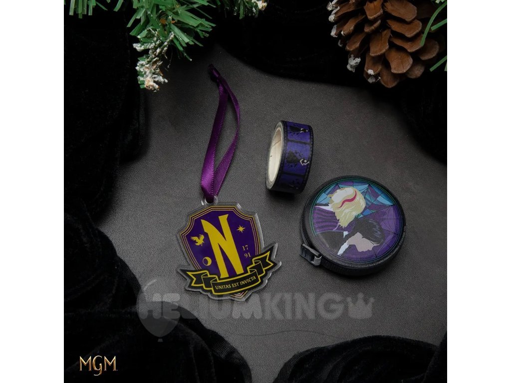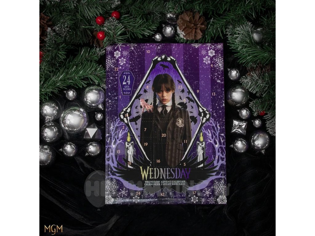 Adventný kalendár Wednesday obsahuje 24 rôznych darčekov: ponožky, meter, odznak, plátená taška, visačka na batožinu, zápichy, náramok, nálepky, pero, záložky, visiaca ozdoba, pravítko, notes, guma, ozdobná páska, zvýraznovač, vrecko so šnúrkou, magnet, nášivka, sponka, akrylová ozdoba, hádanka, svietiace nálepky, prívesok na kľúče