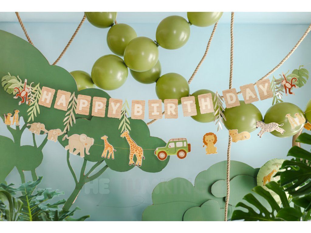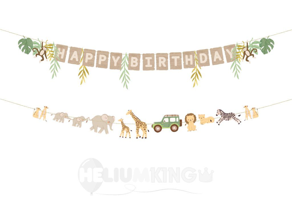 Štýlová a hravá dekorácia, ktorá vytvorí dokonalú narodeninovú atmosféru. Súprava obsahuje béžový banner s nápisom „Happy Birthday“ doplnený o motívy listov a opíc (dĺžka 180 cm) a girlandu so safari motívmi (dĺžka 180 cm). Obe časti sú spojené zlatým povrázkom s celkovou dĺžkou približne 280 cm. Banner je pripravený na okamžité použitie priamo z balenia a vďaka svojmu originálnemu dizajnu je ideálny na detské oslavy, tematické párty či rodinné stretnutia.