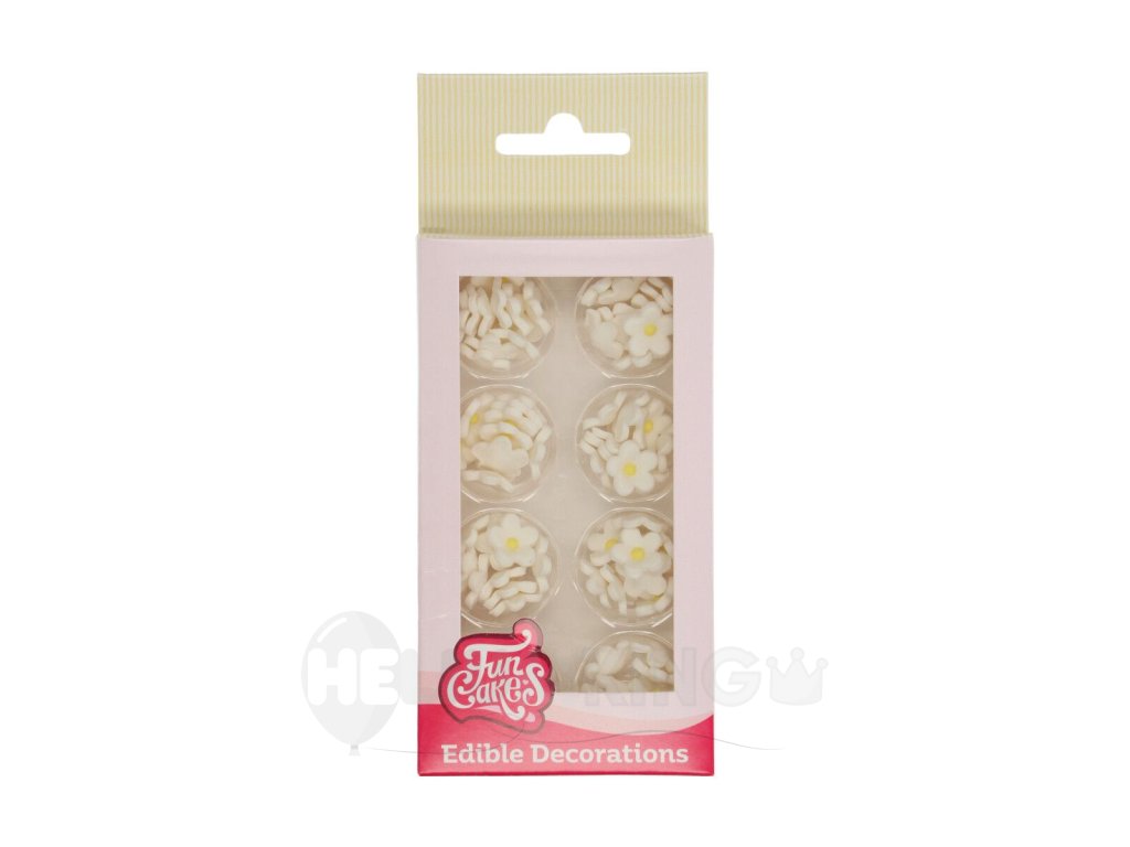 Cukrové zdobenie - kvietky v bielom prevedení sú tradičným zdobením dámskych, dievčenských jemných a elegantných tort alebo zákuskov. Vyniknú a ozvláštnia cupcakes, muffins, cookies alebo krémové koláčiky.