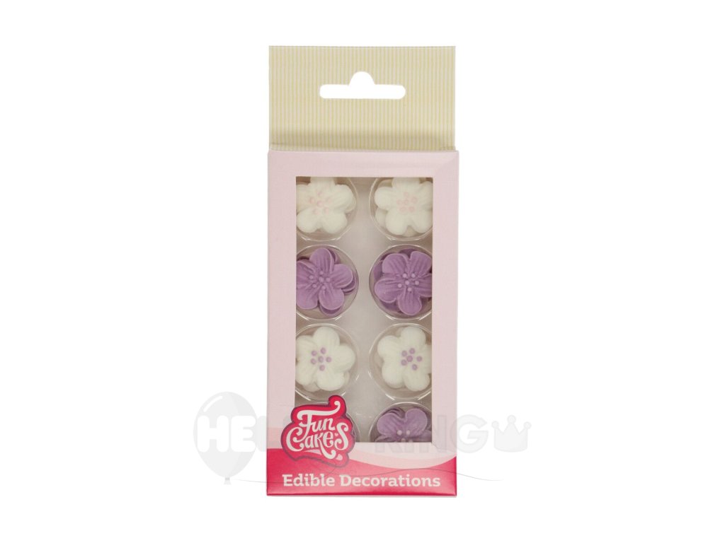 Cukrové zdobenie - kvietky vo fialovom a bielom prevedení sú tradičným zdobením dámskych, dievčenských jemných a elegantných tort alebo zákuskov. Vyniknú a ozvláštnia cupcakes, muffins, cookies alebo krémové koláčiky. Set obsahuje 24 ks jedlých cukrových kvietkov.