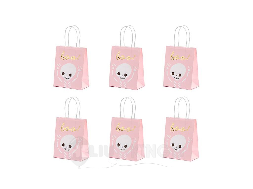 Skvelá darčeková taštička v ružovej farbe s obrázkom kostry a zlatým nápisom boo. Je vhodná, ak chcete darovať malú pozornosť pre Vašich hostí na halloweenskej párty, alebo inej oslave. Hodí sa aj na malý darček pre oslávenca, ktorý má rád strašidelné postavičky.