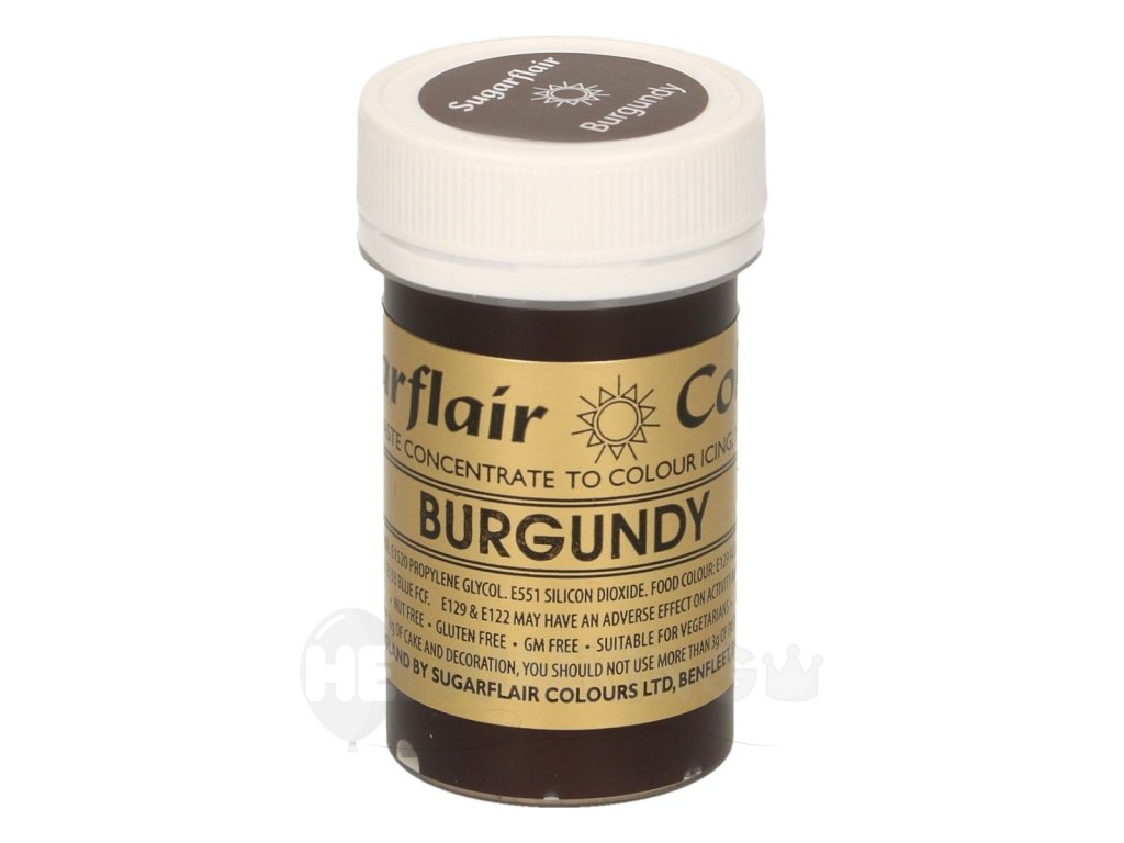 Gélová farba Burgundy je koncentrovaná farba vhodná na farbenie poťahovacej alebo modelovacej hmoty. Bordová gélová jedlá farba sa výborne hodí na dámske torty. Produkt neobsahuje lepok, geneticky modifikované suroviny a je vhodný vegetariánov.