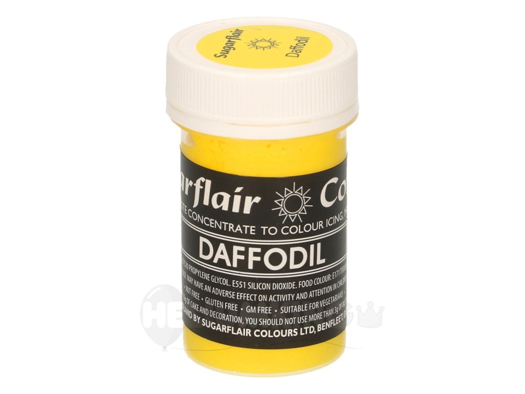 Gélová žltá farba Daffodil je koncentrovaná farba vhodná na farbenie poťahovacej alebo modelovacej hmoty. Žltá gélová jedlá farba sa výborne hodí na dievčenské torty. Produkt neobsahuje lepok, palmový olej, geneticky modifikované suroviny a je vhodný pre vegánov a vegetariánov.