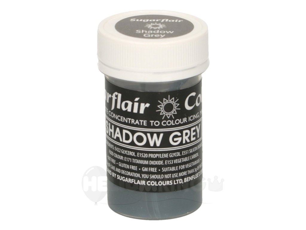 Sivá žltá farba Shadow Grey je koncentrovaná farba vhodná na farbenie poťahovacej alebo modelovacej hmoty. Sivá gélová jedlá farba sa výborne hodí na dievčenské torty. Produkt neobsahuje lepok, palmový olej, geneticky modifikované suroviny a je vhodný pre vegánov a vegetariánov.