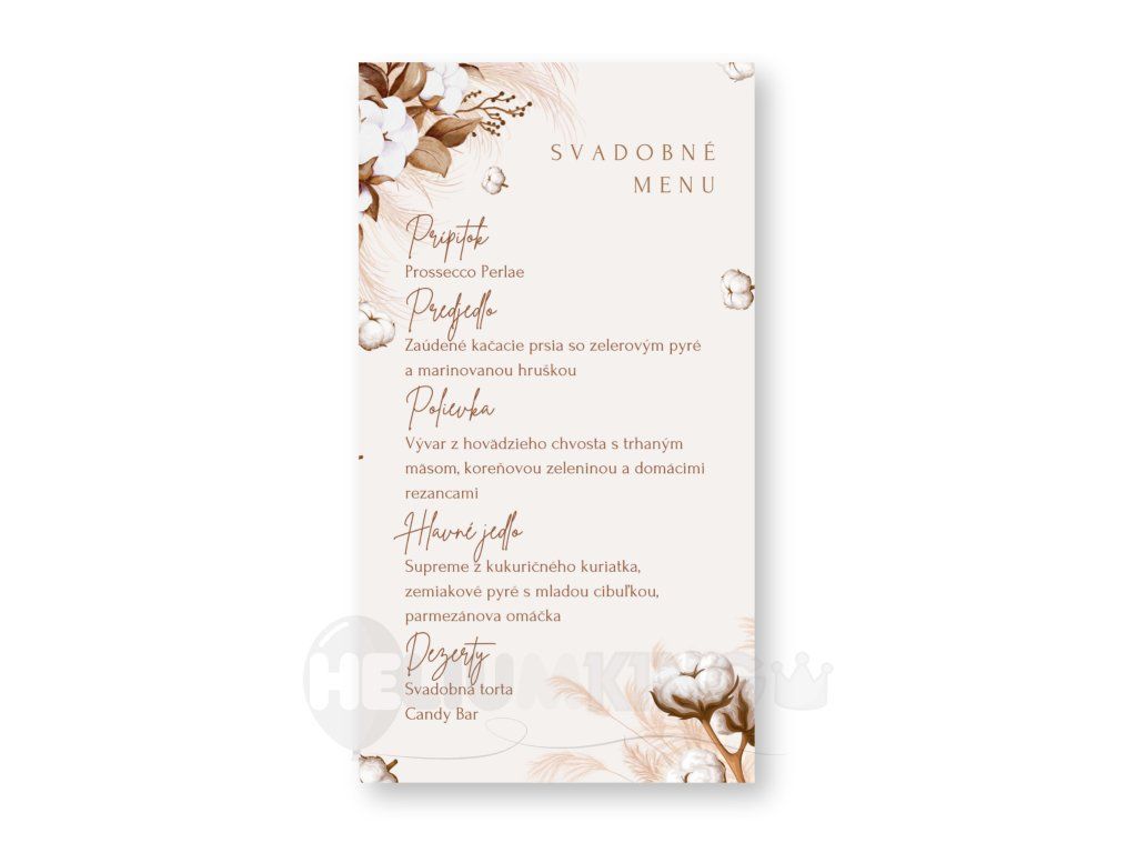 Pripravte krásny set a toto svadobné menu skombinujte s etiketou na víno alebo oznámením v rovnakom dizajne a zabezpečte, aby každý detail Vašej svadobnej oslavy bol dokonale zladený.