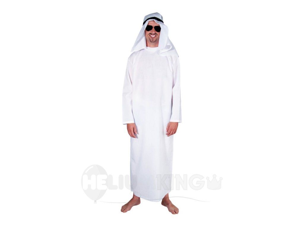 Kostým obsahuje: biely tunikový overal z ľahkého, priedušného materiálu, ktorý zabezpečí, že sa nezapotíte ani pri tanci na púšti. Súčasťou je aj elegantná čierno-biela šatka na hlavu s čiernou čelenkou – pre dokonalý šejkovský look.