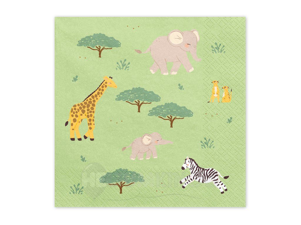 Veselé papierové servítky Safari s rozmerom 33 × 33 cm sú praktické jednorazové servítky s hravým motívom, ktoré sú ideálne na oslavy, detské párty, pikniky alebo iné príležitosti. Balenie obsahuje 12 kusov servítok, ktoré sú vyrobené z kvalitného papiera a dobre absorbujú vlhkosť. Farebný Safari dizajn dodá prestretému stolu hravý vzhľad a zároveň zabezpečí praktické využitie počas stolovania.
