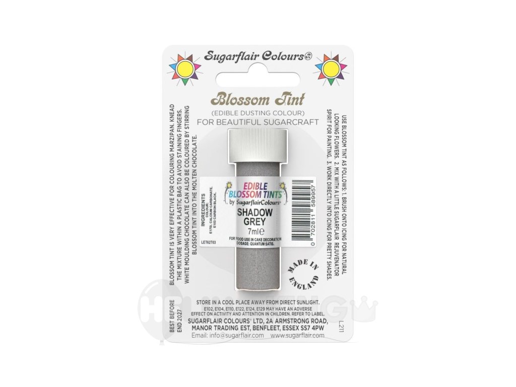 Sugarflair Blossom Tint Shadow Grey je jedlý farbiaci prášok v odtieni sivej. Je vhodná na vytváranie realistických efektov zhotovených výrobkov z fondánu. Môže byť tiež použitá ako farba. Zmiešajte prášok s trochou alkoholu. Nanášajte na povrch výrobkov štetcom.