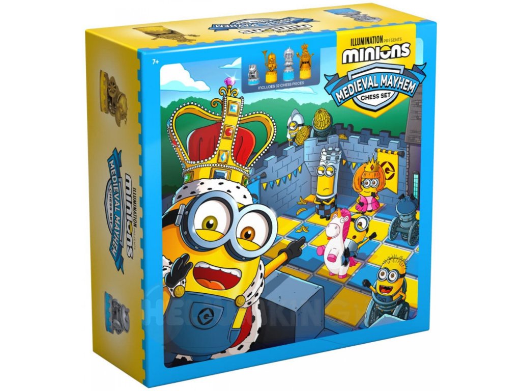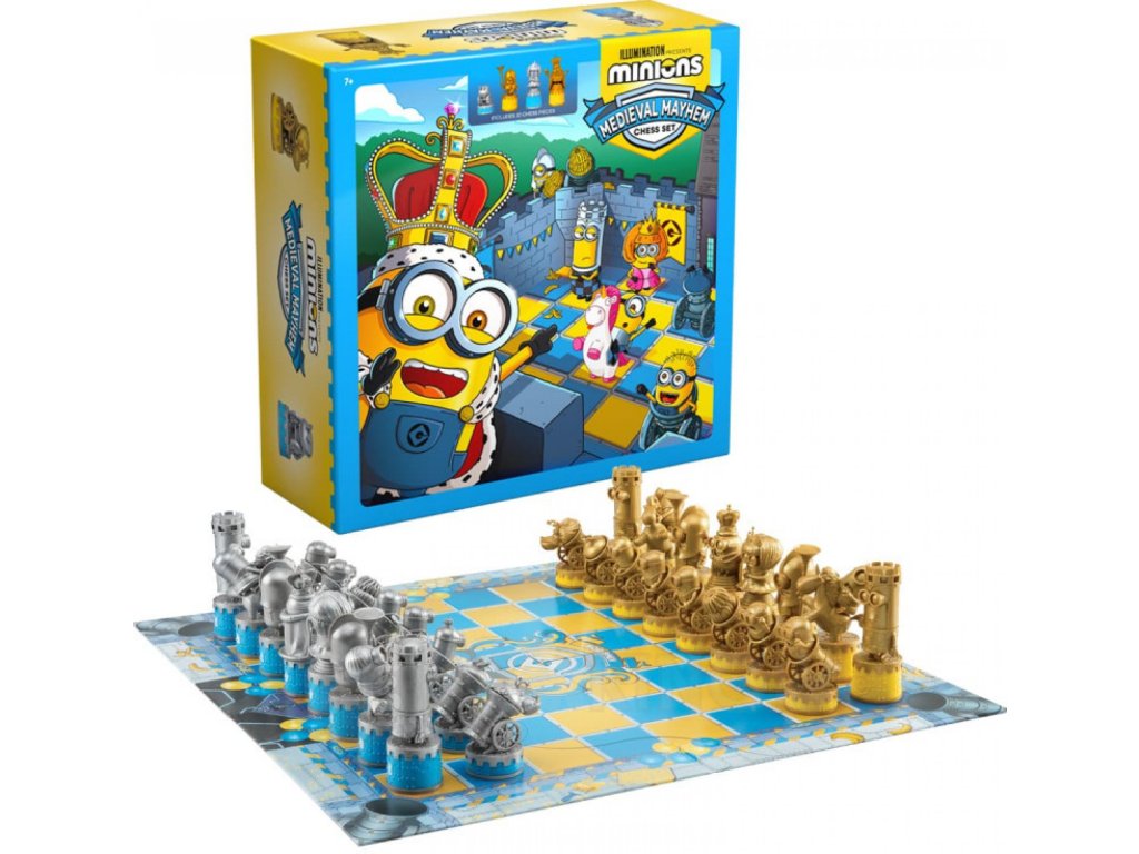 Šach zo série Mimoni, Vás prenesie do sveta rozprávky a zároveň potrénuje taktické myslenie. Šachová súprava obsahuje 32 ks precízne vyobrazených figúrok najznámejších mimoňov.