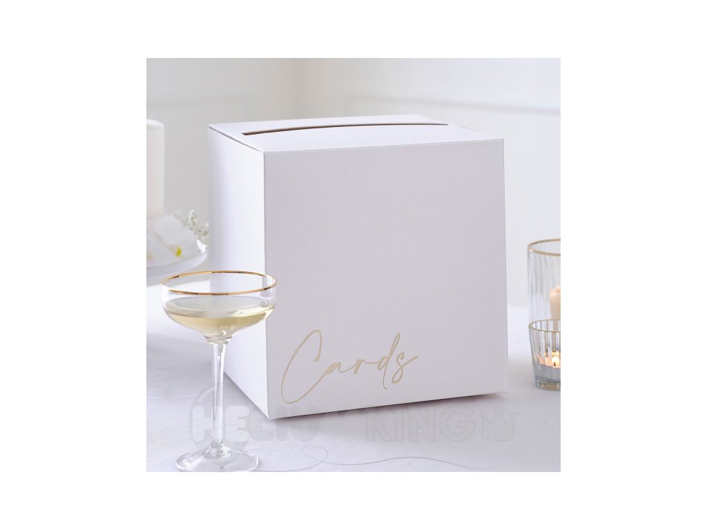 Táto krabička na obálky, či peniaze Vám nielen doplní výzdobu, ale pomôže Vám uložiť malé pozornosti od hostí. Svadobnú krabičku v bielej farbe zdobí zlatý nápis ´Cards´ a otvor na vkladanie prianí. Krabicu jednoducho zložíte, a umiestnite na viditeľné miesto na Vašej svadobnej oslave.
