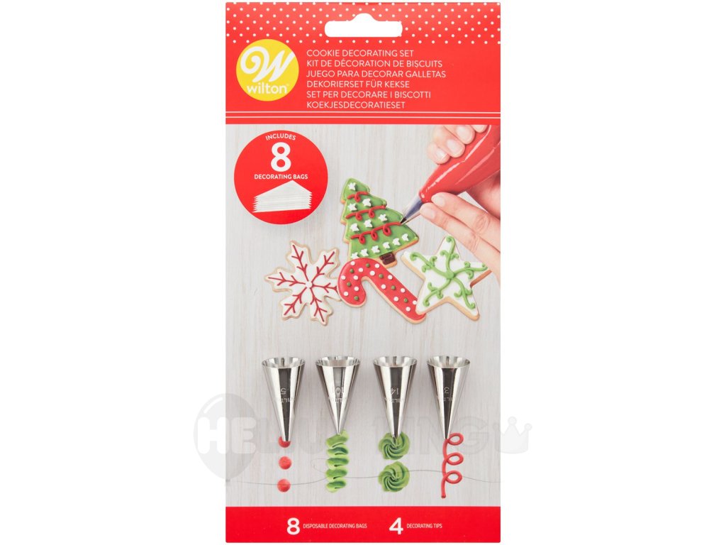 Sada obsahuje všetky pomôcky, ktoré potrebujete na zdobenie vianočných koláčikov a pečiva. Sada obsahuje trezírovacie vrecúška a špičky, s ktorými vytvoríte tie najoriginálnejšie vianočné zdobenia. Zdobenie je vhodné na medovníky, linecké pečivo, cookies a ďalšie dezerty.