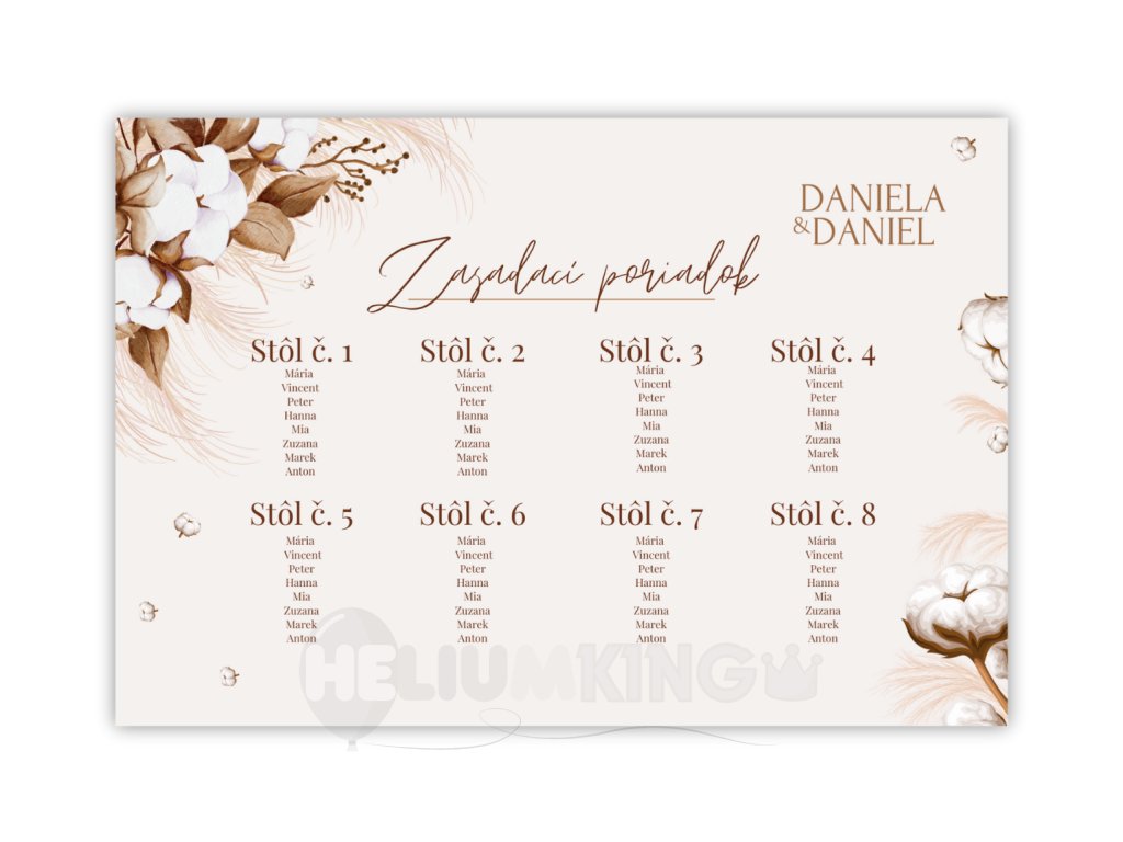 Pripravte krásny set a tento zasadací poriadok skombinujte s svadobným oznámením, etiketou na víno, menu alebo nálepkou v rovnakom dizajne a zabezpečte, aby každý detail Vašej svadobnej oslavy bol dokonale zladený.